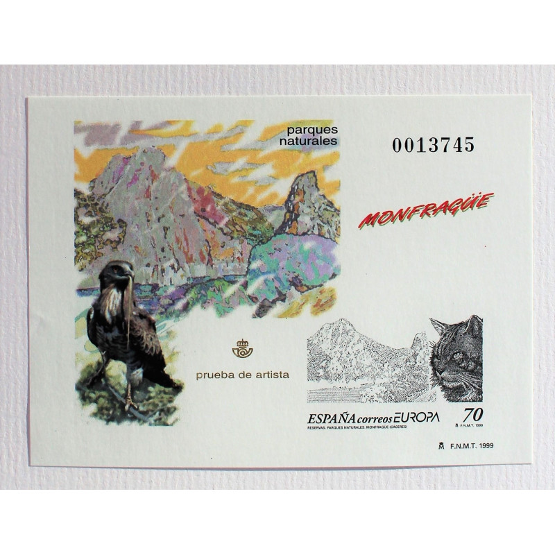 PRUEBA DE ARTISTA DEDICADA AL CUARTO CENTENARIO DE LA PLAZA MAYOR DE MADRID.REPRESENTA LA FACHADA DE LA CASA DE LA PANADERIA,CON EL SELLO DE 5 € DE FELIPE III A CABALLO,EN ORO DE 24 QUILATES,SOBRE BASE DE PLATA DE LEY.
