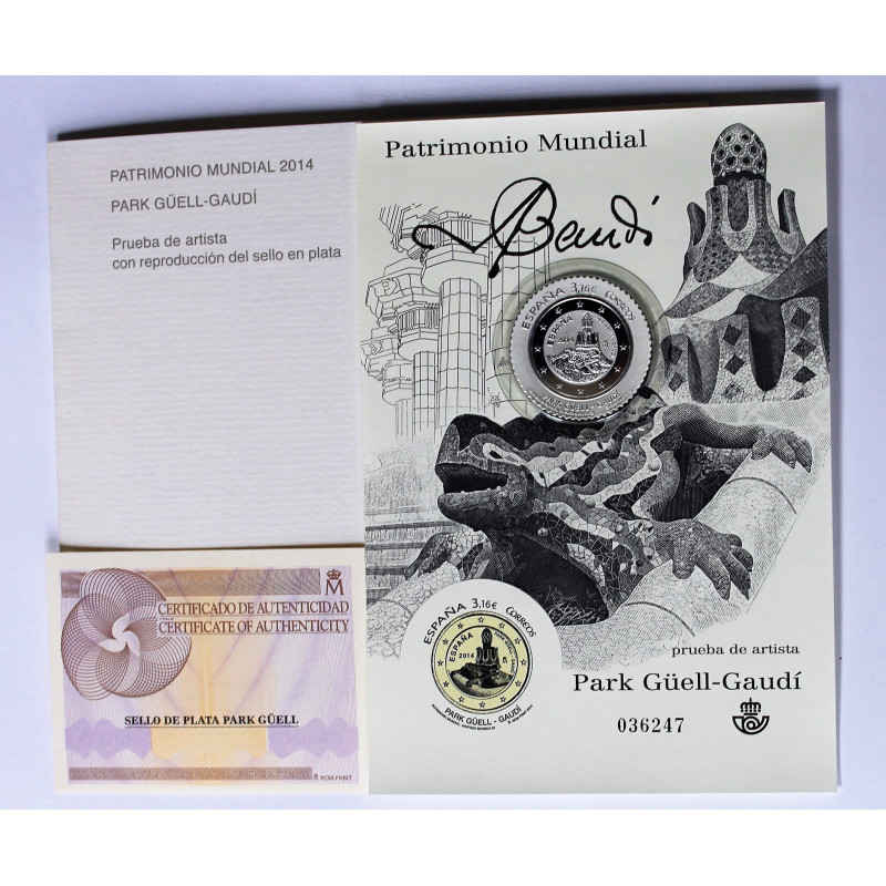 PRUEBA DE ARTISTA GAUDI,PATRIMONIO MUNDIAL .PARK GËLL CON SELLO PLATA E ILUSTARCION DE EL DRAGÓN EMBLEMATICO DE ANTONIO GAUDI.