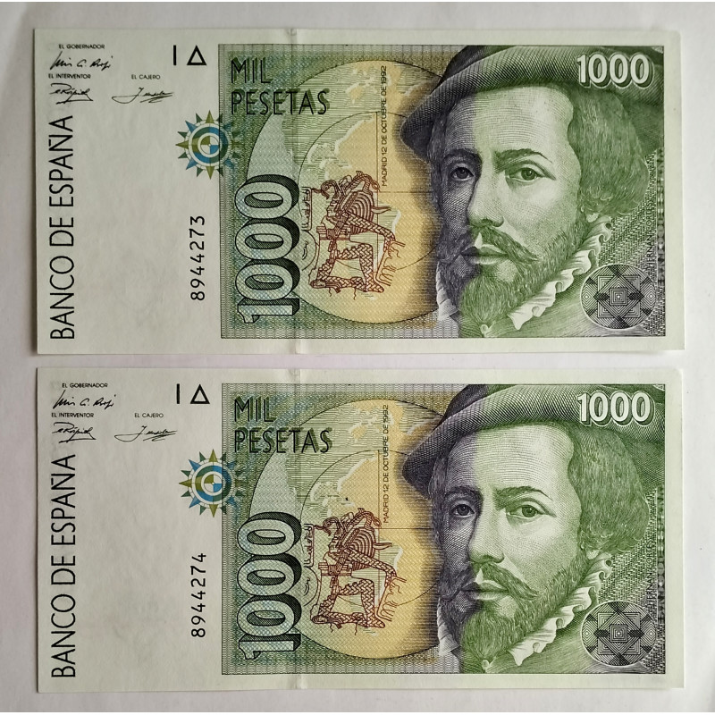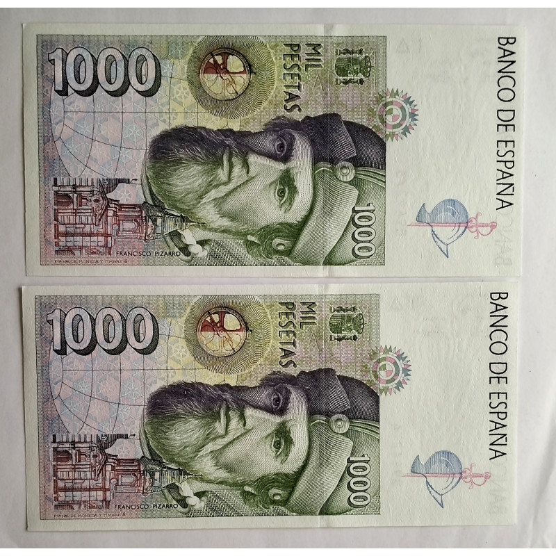Pareja correlativa de billetes de Francisco Pizarro sin circular de 1.000 pesetas.