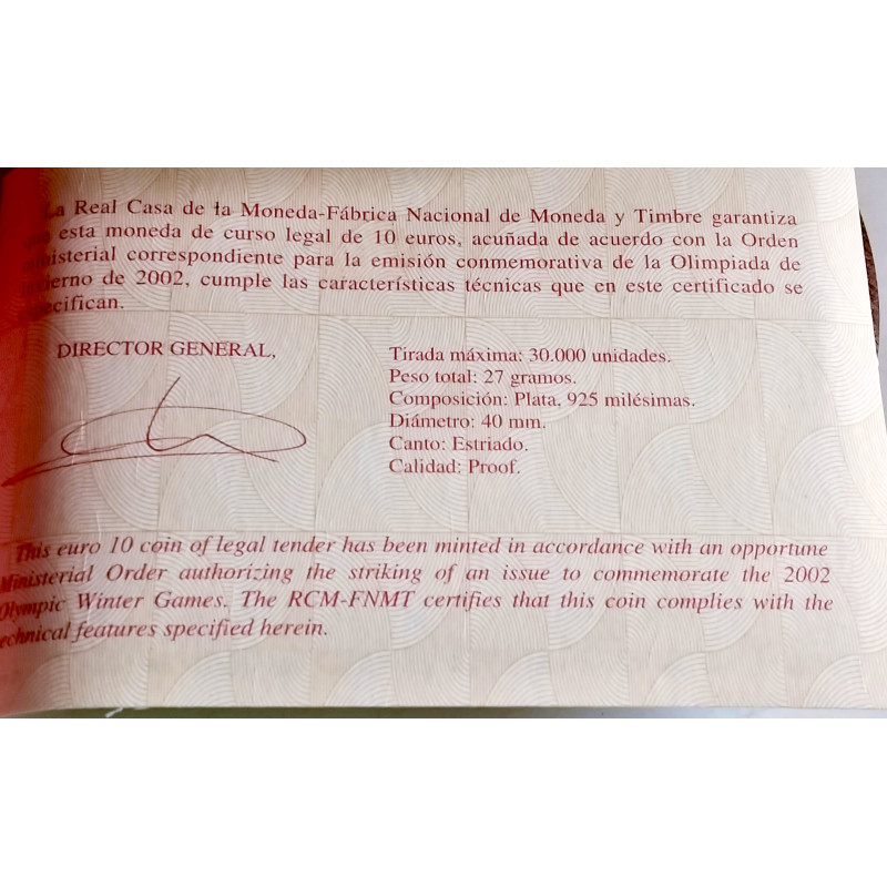 Moneda de 10 euros de plata dedicada los juegos Olímpicos de invierno año 2002