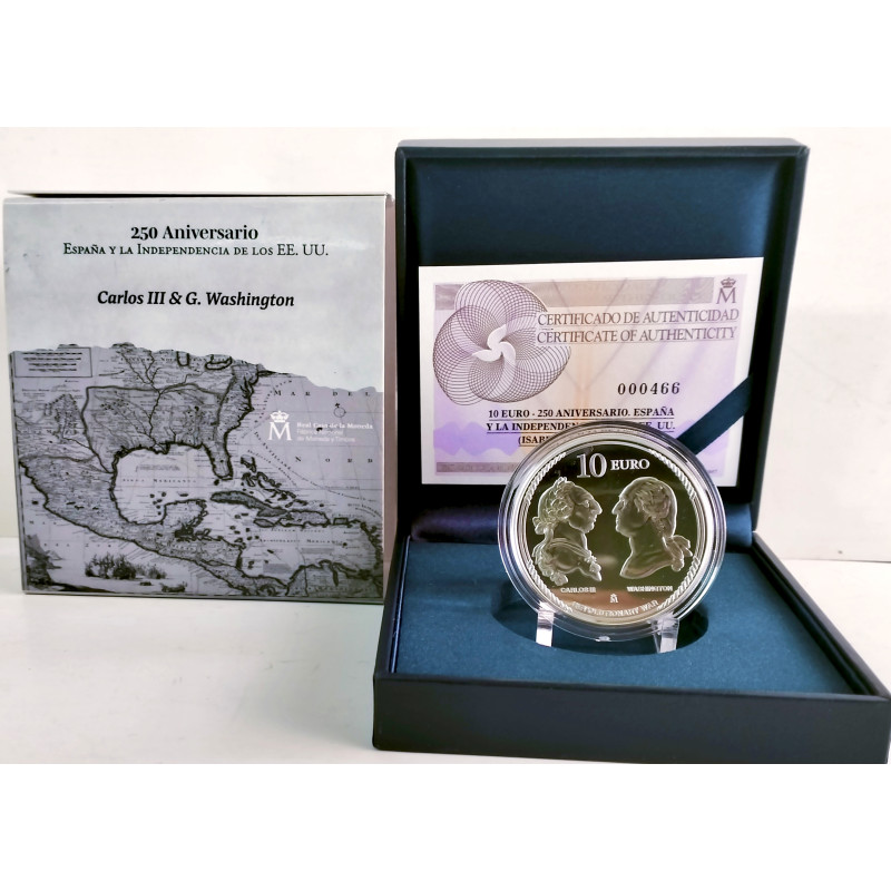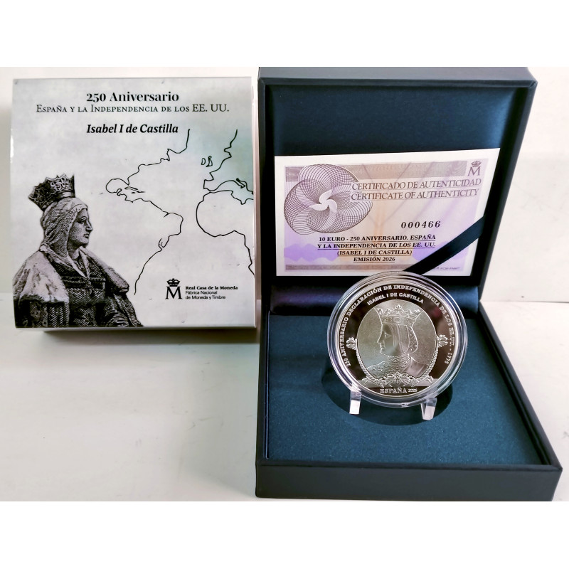Moneda de Isabel I de Castilla de 10 euros de plata del 250 aniversario de la declaración de independencia de los Estados Unidos de América.