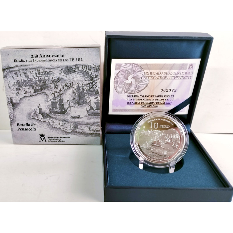 Moneda de el general Bernardo de Gálvez de 10 euros de plata del 250 aniversario de la declaración de independencia de los Estados Unidos de América.