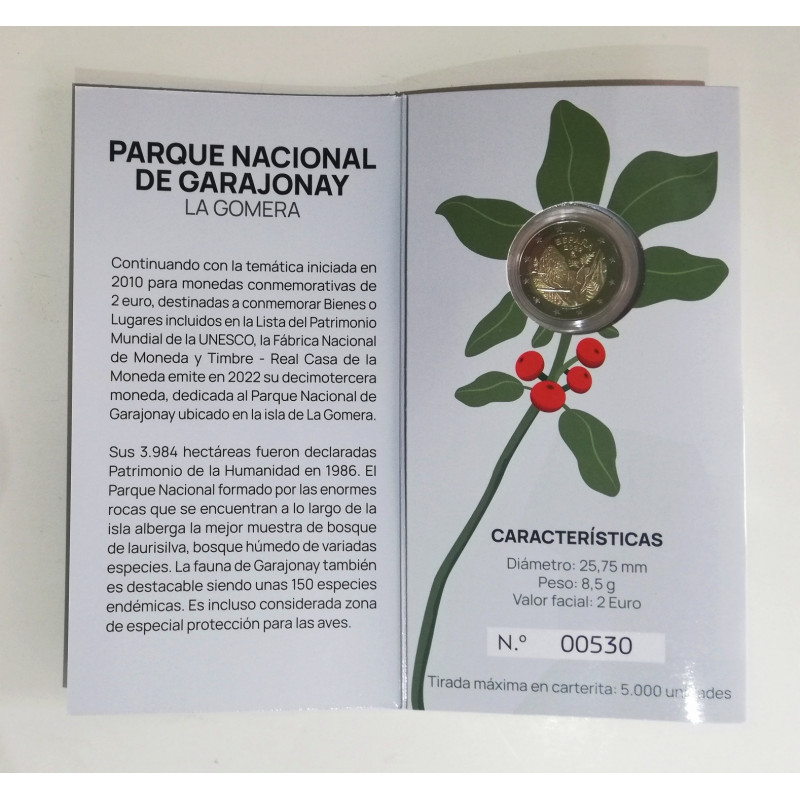Cartera oficial de la F. N. M. T con la moneda bimetalica de 2 euros conmemorativa de España 2022 en calidad Proof, dedicada al parque y espacio natural protegido y patrimonio de la humanidad por la Unesco de Garajonay, en la isla de la Gomera.