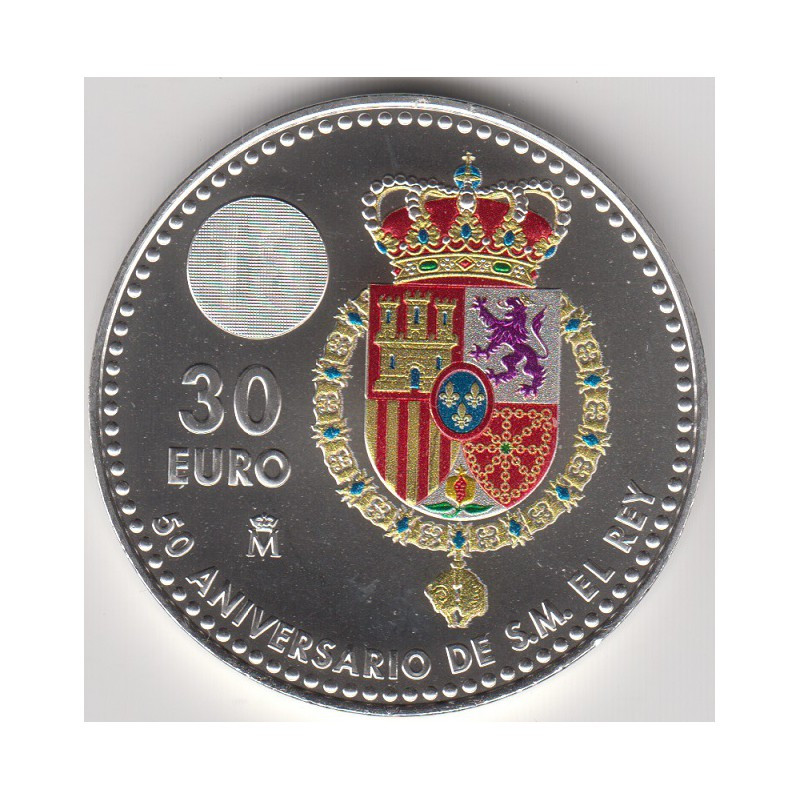 30 Euros plata con motivo del quincuagésimo aniversario del nacimiento de Su Majestad el Rey Don Felipe VI.