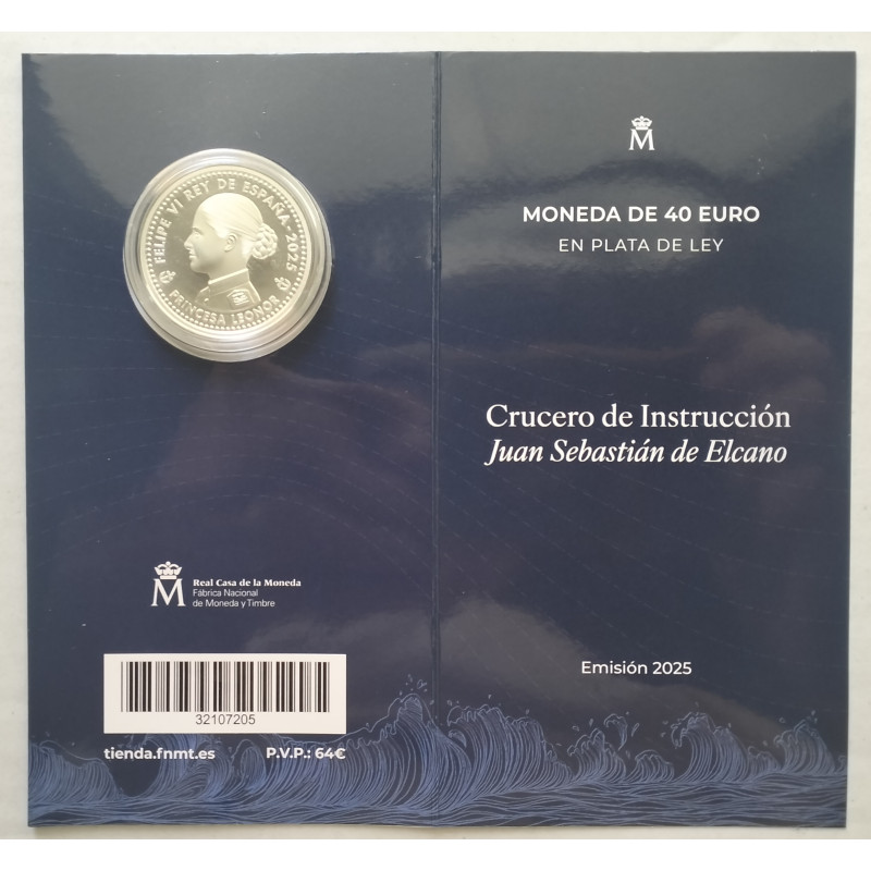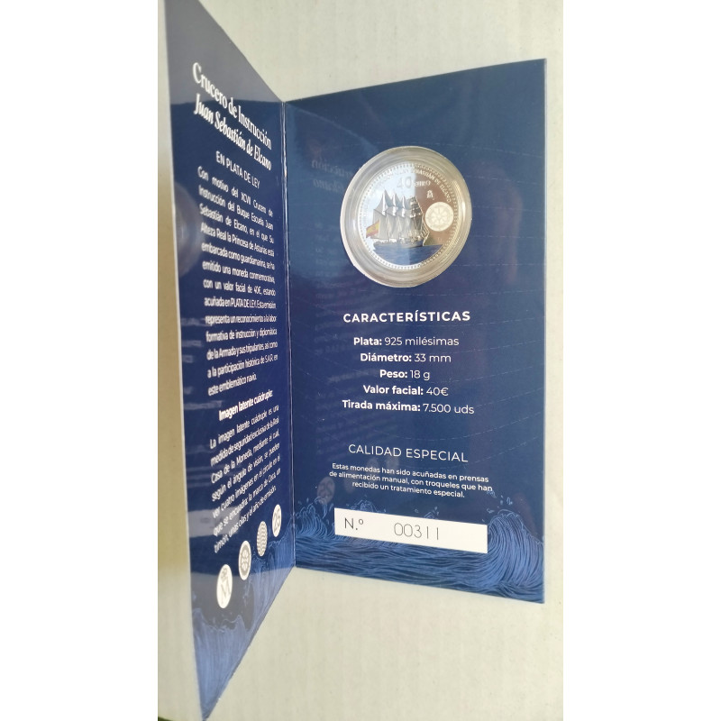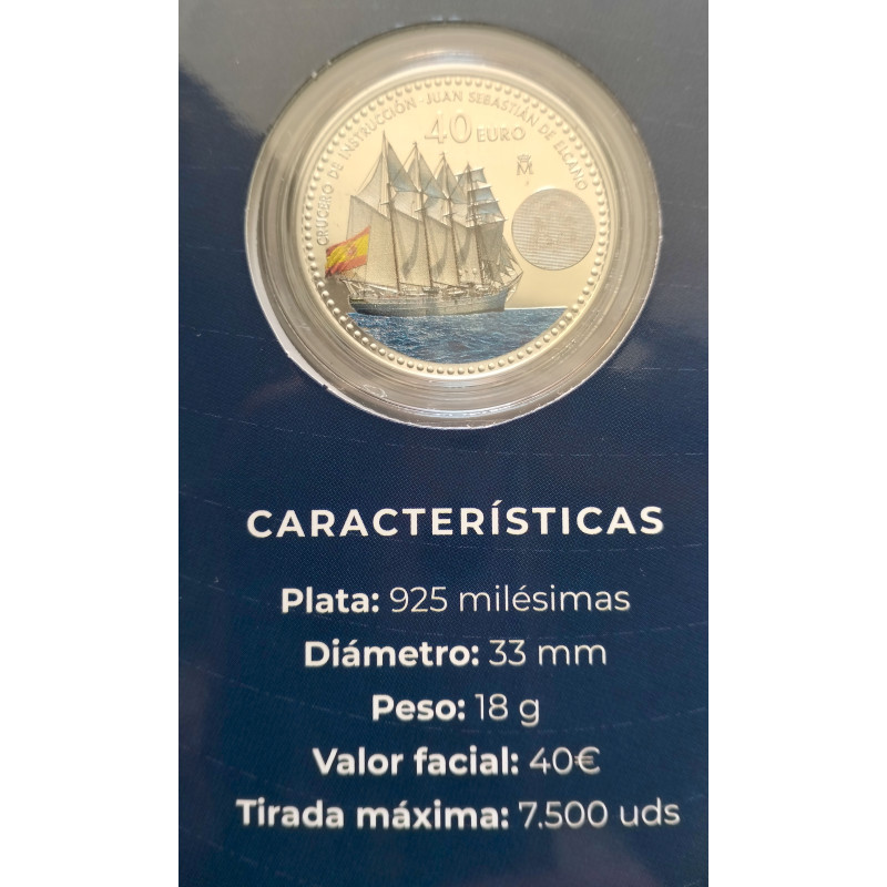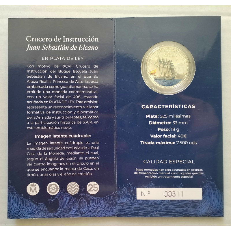 Con motivo del XCVII Crucero de instrucción del buque escuela Juan Sebastián Elcano en el que su Alteza Real la Princesa de Asturias está embarcada como guardia marina, se ha emitido una moneda conmemorativa con un valor facial de 40 euros ,estando acuñada en plata de ley .