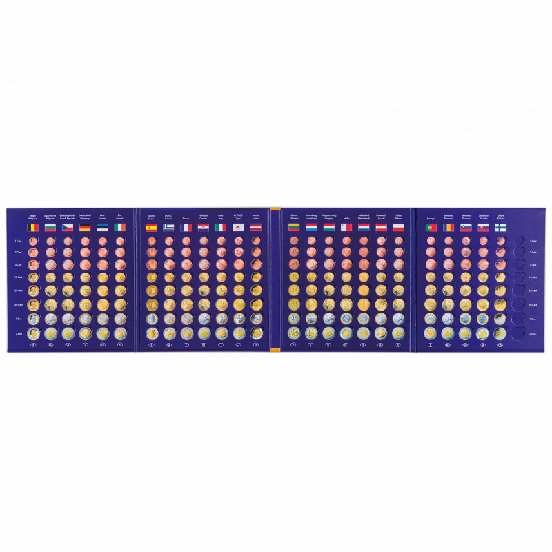 Álbum de rico colorido de un resistente cartón impreso de alta calidad, con perforaciones exactas para insertar 26 series completas de monedas en euros de curso legal (1 céntimo a 2 euros). Incluye todos los países del euro, excepto los pequeños estados de Mónaco, San Marino, El Vaticano y Andorra. Tamaño exterior (cerrado): 255 x 280 mm.