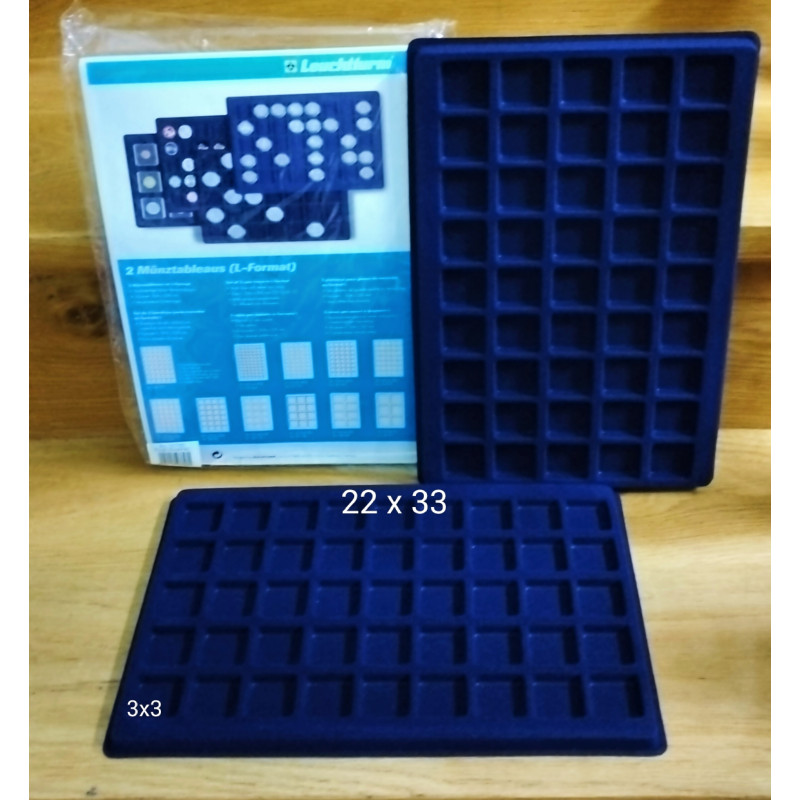 Pareja de bandejas azules Cargo L con 45 espacios para meter cualquier artículo de 3 x 3 centímetros ,como por ejemplo: chapas de cava, monedas de 2 euros(o inferiores a diámetro de 30 mm) ,anillos,cadenas etc