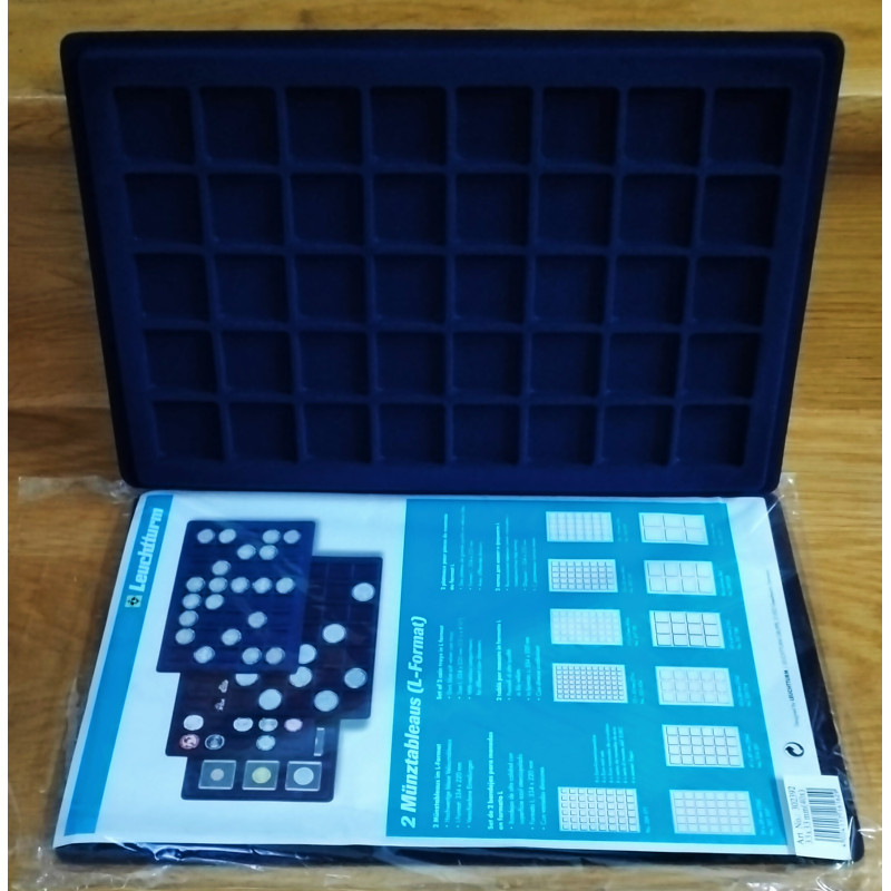 2 Bandejas con 40 compartimentos rectangulares, para monedas de hasta 33 milímetros, cada una.