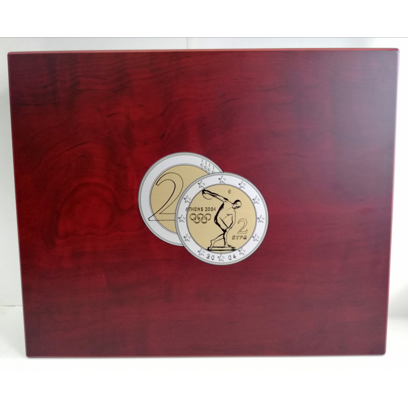 El la tapa se refleja en dorado la imagen de la moneda de 2 euros de: " el Discóbolo" primera moneda de 2 € conmemorativa de Grecia 2004.