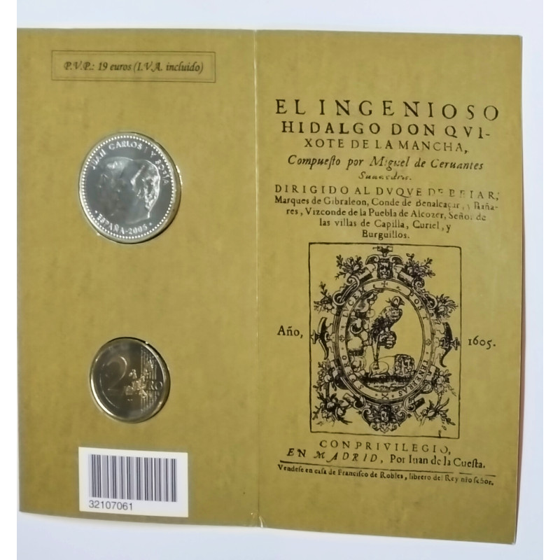 La Real Casa de la Moneda conmemora el IV centenario de la publicación del ingenioso hidalgo don Quijote de la Mancha, con la acuñación de una moneda de plata de ley de 925 milésimas y valor facial de 12 euros, además para rendir homenaje al más universal de los escritores españoles Miguel de Cervantes ,la Real Casa de la Moneda ha acuñado la primera moneda conmemorativa de 2 euros en cuyo anverso se representa una imagen de Don Quijote .