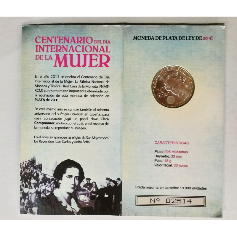 CARTERA NUMERADA DE LA MONEDA DE 20 EUROS DE ESPAÑA CLARA CAMPOAMOR,EN ESTUCHE OFICILAL DE LA FNMT 2011