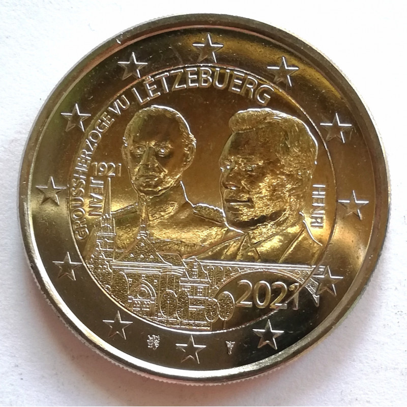 Moneda bimetalica de 2 euros conmemorativa de Luxemburgo del Centenario del nacimiento del Gran Duque Jean del año 2021.