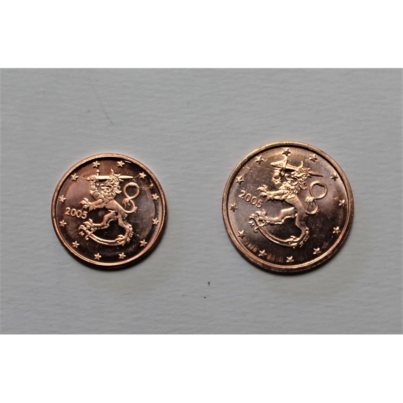 onedas de 1 y 2 céntimos de euro de Finlandia del año 2005.