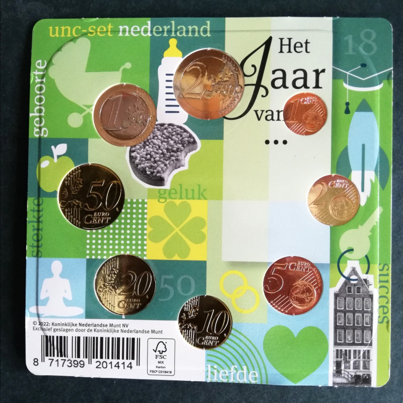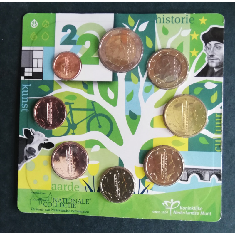 Colección de 8 monedas de euros sin circular, de Holanda año 2022, en cartera- blister oficial con código de barras.