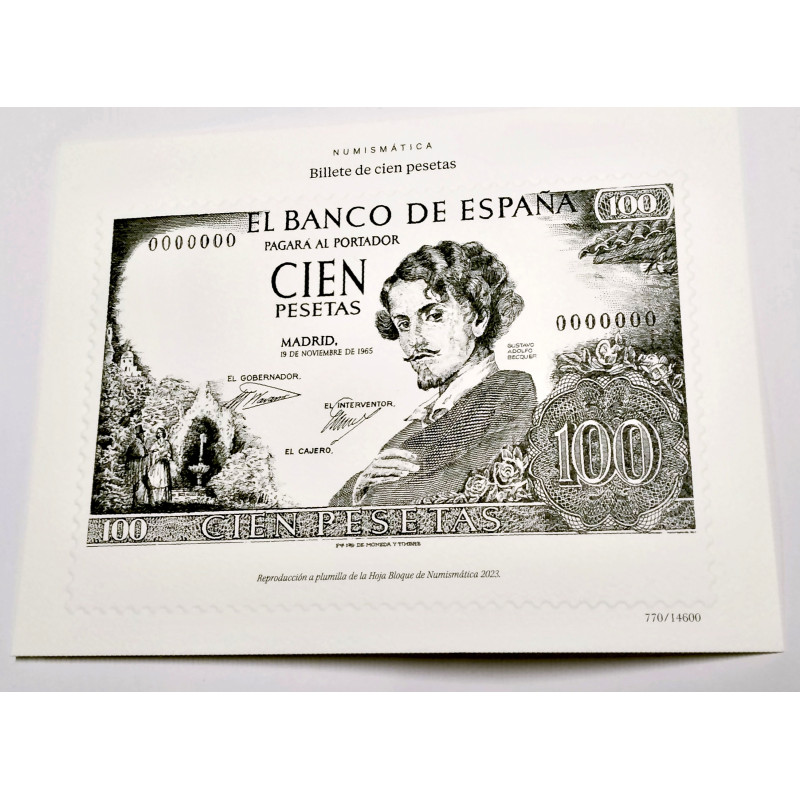 Reproducción la plumilla del billete de la serie numismática del año 2023 de 100 pesetas de Gustavo Adolfo Bécquer..