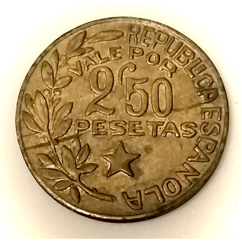 Moneda de latón de la República de 2,50 pesetas del consejo Municipal de Menorca .