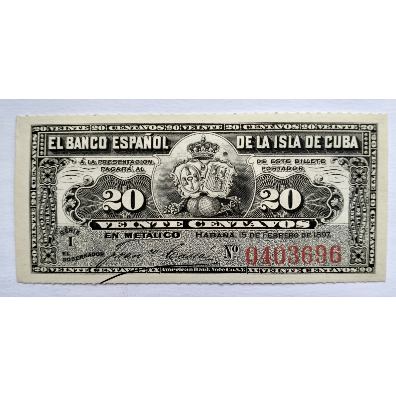 Billete de 20 centavos del Banco Español de la isla de Cuba 1897.