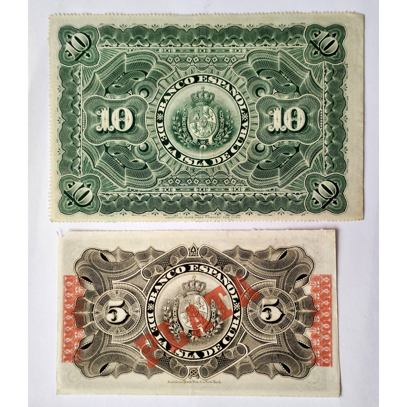 Billetes de 5 y 10 pesos fuertes del Banco Español de la Isla de Cuba del 15 de mayo de 1896