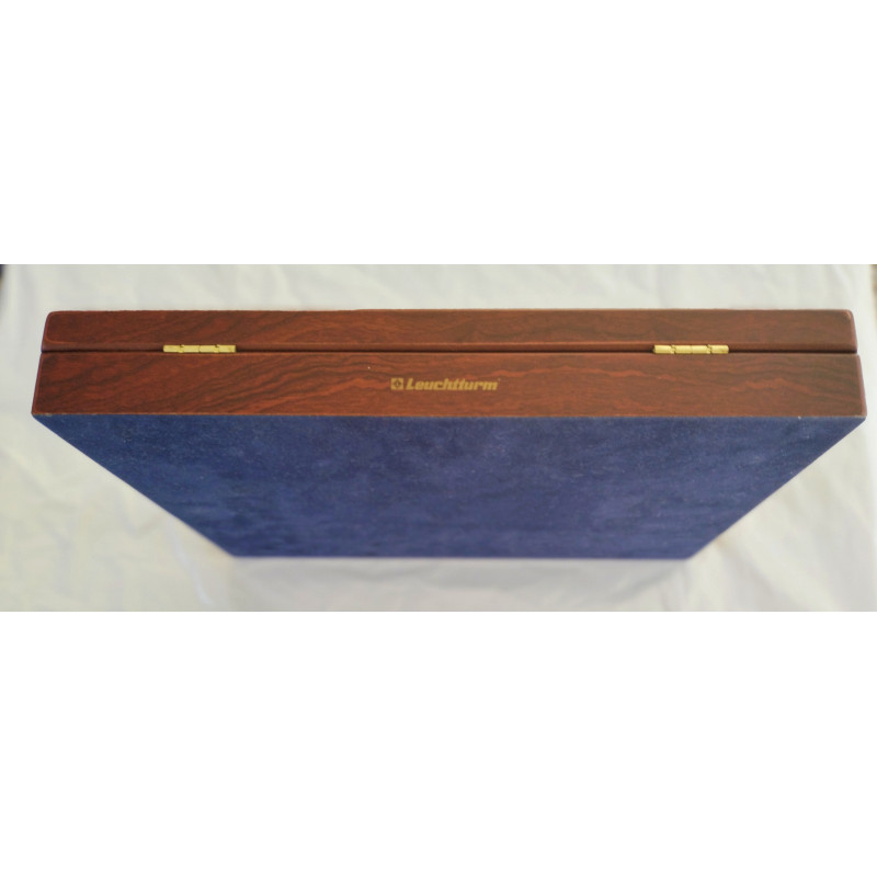 Maletín de madera 265 x 345 con tres bandejas azules aterciopeladas para las 18 series de países euro con sus respectivas cápsulas.