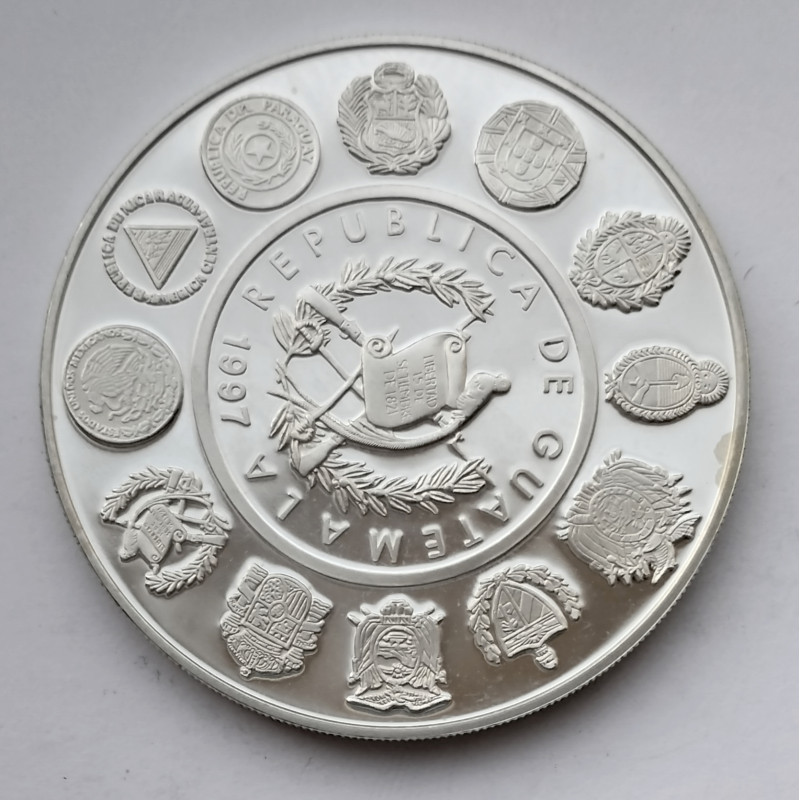 Moneda de plata de 1 quetzal de Guatemala de la serie iberoamericana de danzas y trajes regionales de 1997.
