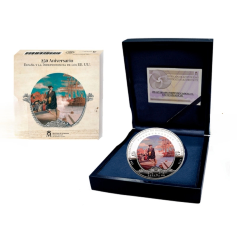 Moneda a color que conmemora la celebración del 250 aniversario de la declaración de independencia de los Estados Unidos de América destaca la contribución española en el éxito de la contienda a favor de las trece colonias americanas.