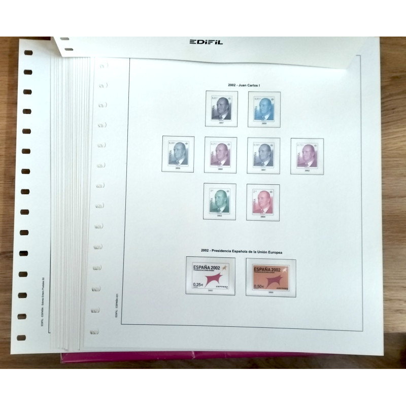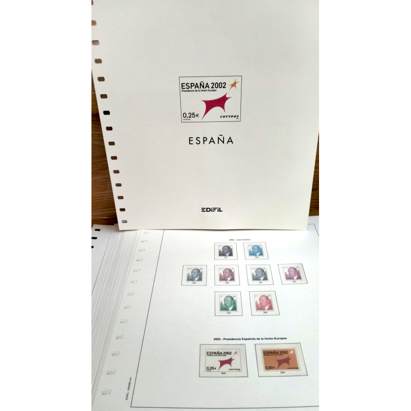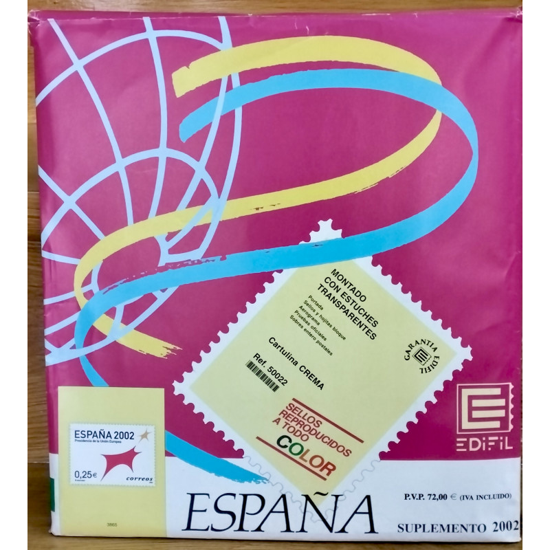 Suplemento completo para todos los sellos del año 2002 de Edifil montado en transparente con cartulina crema canto dorado
