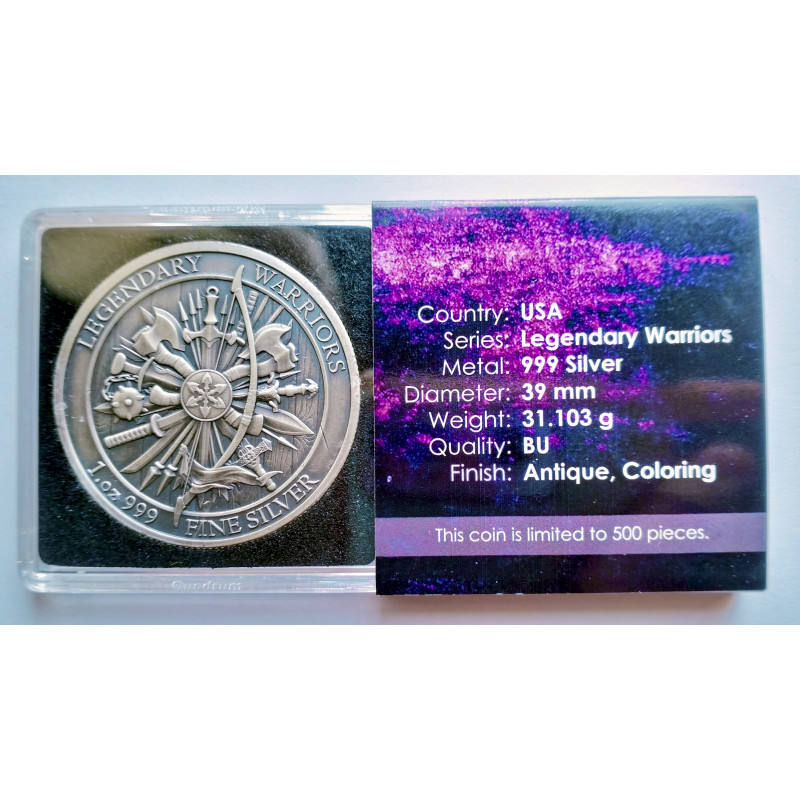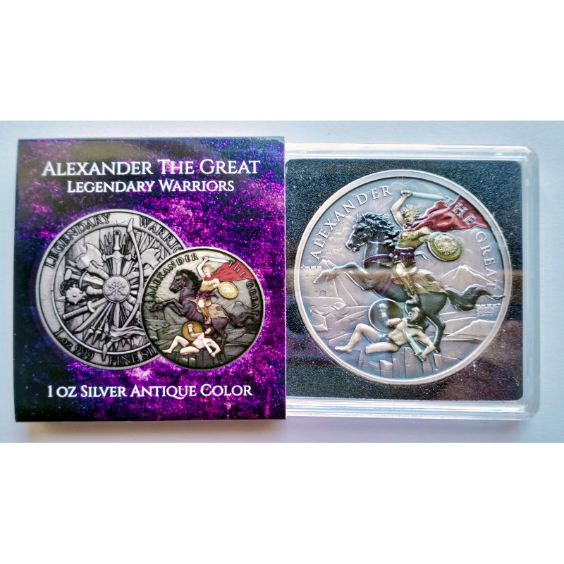 Moneda de 1 onza de plata a color de Alejandro Magno de la serie de personajes legendarios.