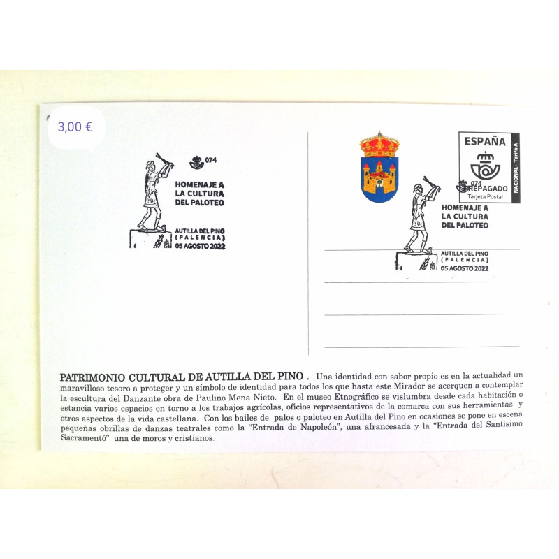 Postal con matasello homenaje al patrimonio cultural de Autilla del Pino, Palencia 2022.