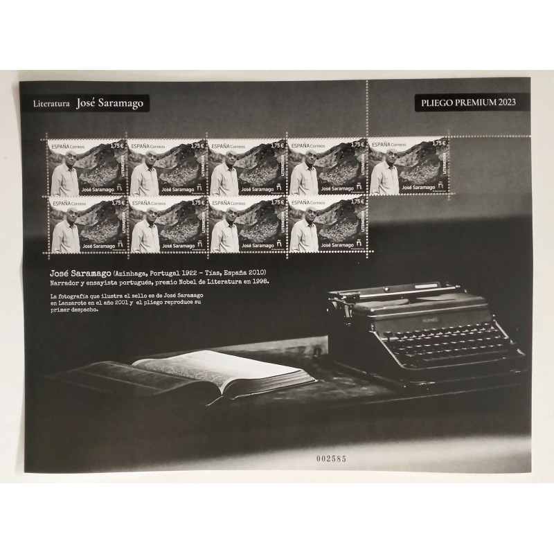 Pliego Premium con 9 sello de literatura dedicado a José Saramago.