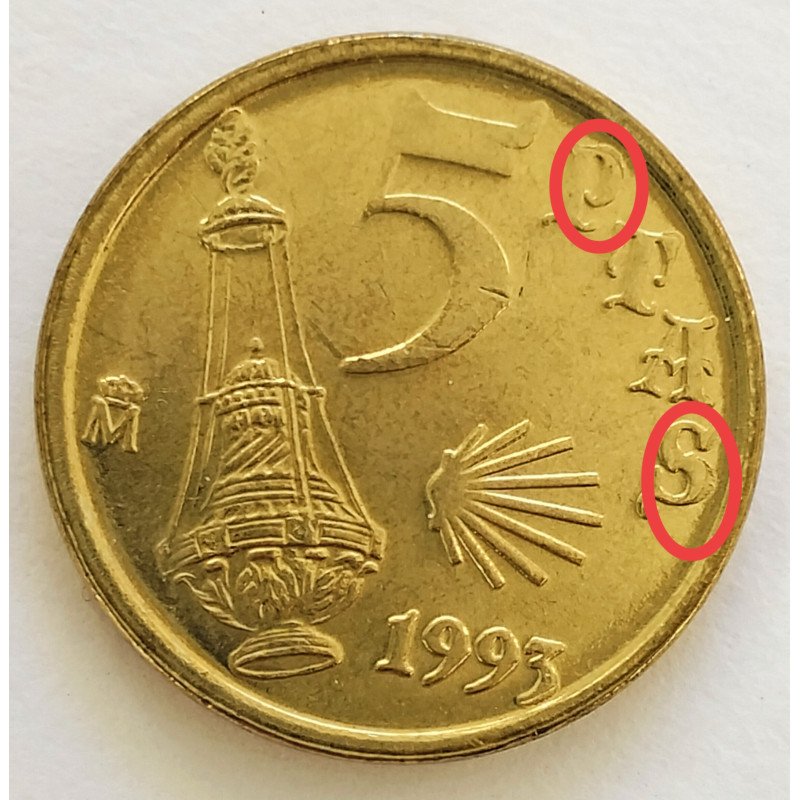 Moneda de 5 pesetas de 1993 con exceso de metal en las letras P y S de "PTAS "